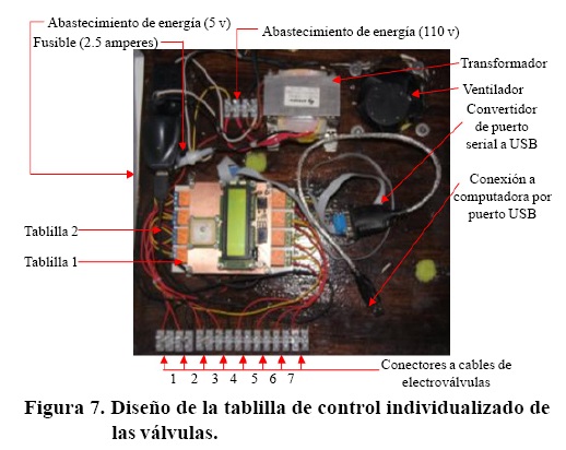 Los circuitos de la tablilla 1 se conectaron a una tablilla 2 (Figura 6) vía puerto serial, donde recibe la información de la computadora para la operación de las válvulas. La tablilla 2 desarrolló los circuitos para la operación de cada válvula en forma independiente, estuvieron conectados al switch de cada control obteniendo la potencia necesaria para el cierre y apertura.