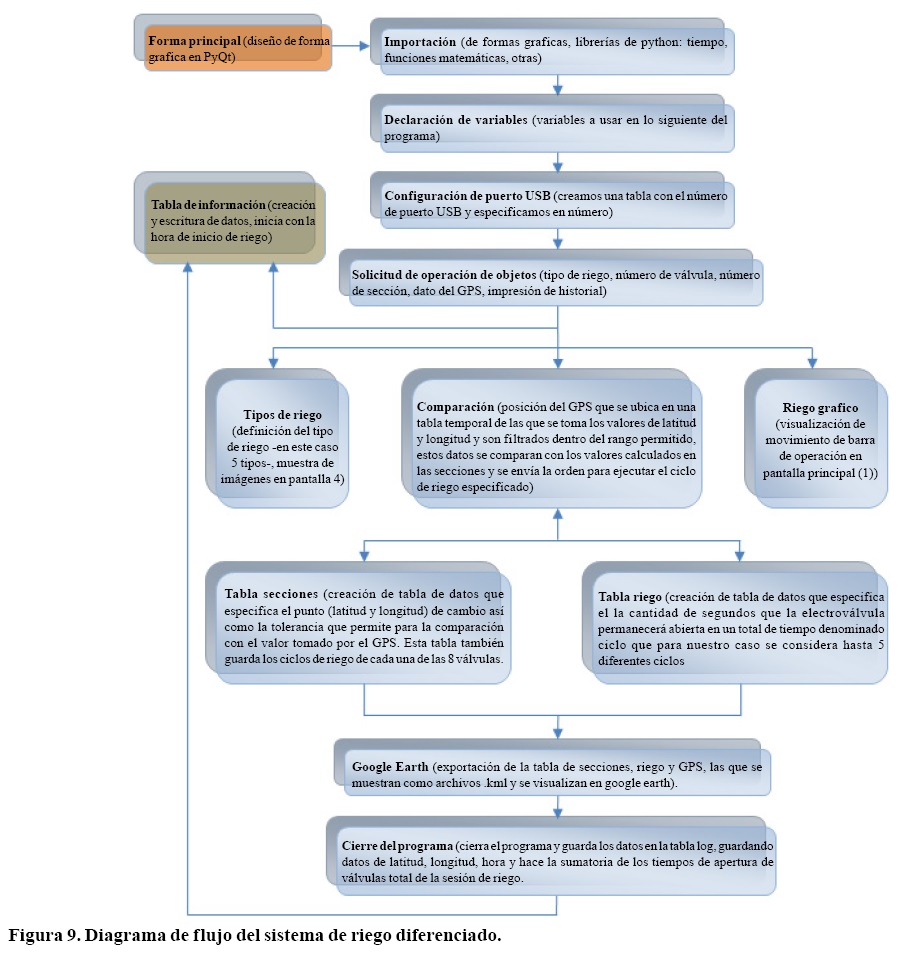 En la Figura 8 se describe el flujo de información y energía de los componentes del sistema. La información que se obtuvo por el GPS se transmitió a la tablilla 1 y a su vez a la computadora. Por otro lado, se definieron zonas "homogéneas" que determinaron el riego diferenciado, los datos generados fueron procesados e integrados al programa. Después de la comparación de la posición del GPS con el mapa pre-establecido envió la orden de tiempo de apertura y cierre de válvulas según el agua que se requirió a la tablilla 2, esta recibió la información del tiempo y envió el impulso a los relevadores, los cuales tenían la energía necesaria para operar las válvulas.