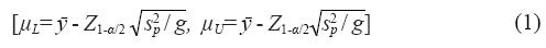 Donde: Z1-α/2 es el cuantil 1-α/2 de la distribución normal estándar. La ecuación (1) es igual a la propuesta por Kendziorski et al. (2003), pero con la diferencia de que se usa Z1-α/2 en lugar del cuantil 1-α/2 de la distribución t-student con g-1 grados de libertad. Esta sustitución no provoca problemas graves de subestimación. Por otro lado, este IC es fácil de calcular y permite derivar una fórmula cerrada para el tamaño de muestra, aunque cuando g es pequeño, la amplitud del IC es más grande.
