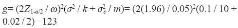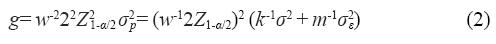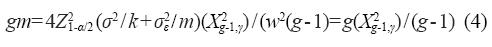 Ésta fórmula puede usarse para estimar el número de grupos requeridos que se usaran en la estimación de la expresión media de un gen, considerando un tamaño de grupo fijo k, m mediciones por grupo, y asumiendo que σ2 y σ2 ε son conocidas. Note que si k= m= 1, la Ecuación (2) se reduce a la fórmula estándar para estimar la media bajo muestreo aleatorio simple [n= w-24Z21-α/2σ2]. Sin embargo, en la ecuación (2) los valores de σ2 y σ2 ε son desconocidos, por lo que se usan sus respectivos estimadores.