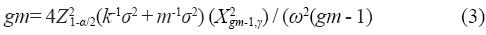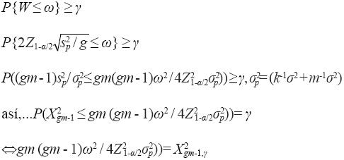 Donde: γ es el grado de certeza (probabilidad requerida) para lograr que la amplitud observada del IC W no sea mayor que el valor deseado ω; X2gm-1,γ es el cuantil γ de la distribución chi-cuadrada con gm - 1 grados de libertad. Con la ecuación (3) se obtiene el tamaño de muestra requerido gm, asegurando que el IC W sea menor o igual a la amplitud deseada ω con una probabilidad de al menos γ. Note que si el nivel de certeza deseado es γ= 0.5, la cantidad X2gm-1,γ / (gm - 1) es aproximadamente igual a 1, por lo que la ecuación (3) se reduce a la ecuación (2), aunque la ecuación (3) considera la aleatoriedad de los estimadores de σ2 y σ2 ε vía el grado de certeza deseado γ. Sin embargo, un inconveniente para derivar el tamaño de muestra exacto es que gm esta en ambos lados de la ecuación (3), requiriéndose de un procedimiento iterativo para resolver la ecuación en términos de gm.