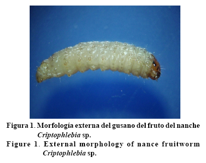 El gusano del fruto del nanche es una larva eruciforme típica, de más de 1.5 cm de longitud en el último instar, cilíndrica, con cabeza bien desarrollada y en posición hipognata, de color café-ámbar, con antenas cortas. Larva de 12 segmentos, los dos últimos fusionados en la región caudal dando la apariencia de 11; el cuerpo de la larva de color verde olivo a cremoso, con la parte dorsal del primer segmento torácico de color café-oscuro. Tiene tres pares de patas torácicas y cuatro pares de pseudopatas en la región abdominal y un par en la región caudal. Un rasgo distintivo de esta larva es una serie de manchas color negro con una seta en cada uno, encontrándose seis por segmento: cuatro en la región dorsal y dos en la región latero-ventral, una arriba y otra debajo de cada espiráculo; un par de manchas de la parte anterior de cada segmento se alinean con las manchas del espiráculo en la región latero-ventral (Figura 1).