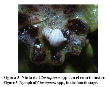 El espécimen de "salivazo" que aquí se describe se aproximó más al género Clastoptera Germar, el cual se le ha relacionado con daños en el cafeto (Coffea arabiga L.) en Brasil (Sánchez y Nakano, 2004); formando asociaciones con plantas actinorrícicas como casuarina (Casuarinaceae) (Sánchez y Segura, 2006) y cacao (Theobroma cacao L.) (Sánchez, 1995) el cual tuvo los siguientes rasgos morfológicos, que coincidieron con los descritos por Hamilton (2001): el rostro prominentemente hinchado donde se aloja la bomba succionadora, de rostro hipognato, cubierto por una corona endurecida sobre la cual se asientan un par de ocelos; entre la parte anterior de la corona y el margen del pronoto se alojan los ojos compuestos, que son prominentes con muchos omatidios.