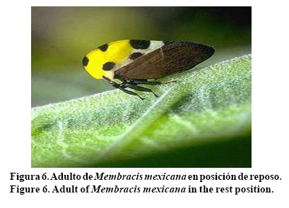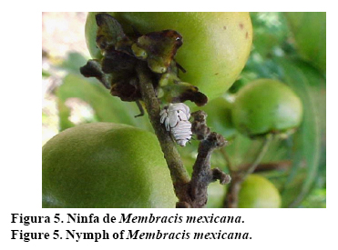 La descripción de Membracis mexicana coincidió con la reportada por Córdoba (2007). Por su parte, Granadino y Cave (1994), encontraron a M mexicana como insecto plaga de la anona (Annona muricata L.). En Nayarit, es una plaga importante en el nanche y ha sido observada también en litchi (Litchi chinensis Sonn.) y sapote prieto (Diospiros digyna Jacq.) con los mismos efectos de la fiimagina.