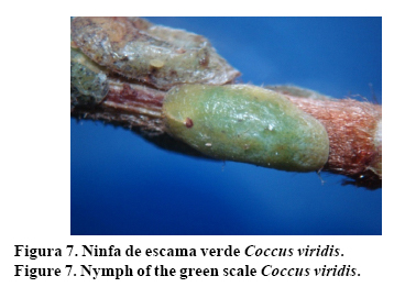 Escama verde Coccus viridis Green. (Hemíptera: Coccidae).