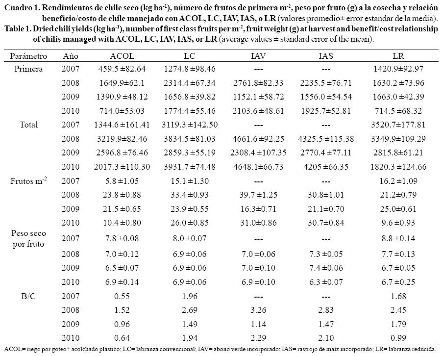 La respuesta del rendimiento del cultivo a los sistemas de manejo varió entre años a causa de la susceptibilidad a factores externos y el comportamiento a localidades de chile. La incidencia de Phytophthora ocurrió en parcelas con ACOL en 2007 y 2010, así como en LR en 2010, afectó los rendimientos total y de primera al reducir el número de frutos por m2. La incidencia de esta enfermedad en plantaciones de chile es usualmente promovida por un alto contenido de agua en el suelo (Ristaino, 1991), lo cual fue en nuestro caso provocado por un exceso de agua dentro de nuestras parcelas de estudio ocasionado por una fuerte tormenta asociado al desnivel de algunos surcos, lo que evitó el flujo libre de ese exceso de agua.