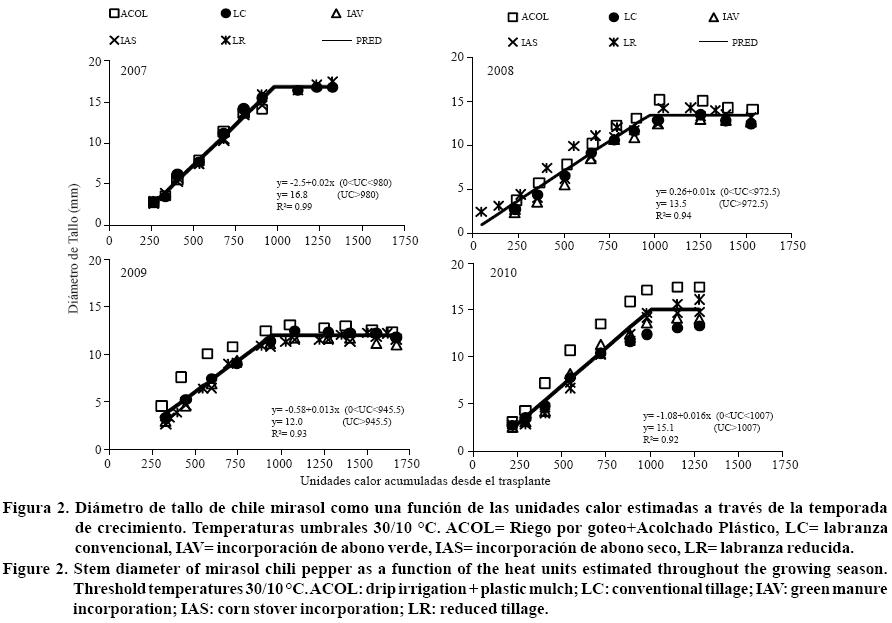 El diámetro del tallo de las plantas de chile fue diferente entre años, pero la respuesta dentro de años a los diferentes tratamientos tecnológicos fue similar (Figura 2). En 2007, las plantas de chile alcanzaron en promedio un diámetro de tallo de aproximadamente 17 mm, mientras que diámetros de 13.5, 12 y de 15 mm se cuantificaron en 2008, 2009 y 2010, respectivamente. En 2009 y 2010, la respuesta de las plantas de chile manejadas con ACOL fue mostrar un diámetro de tallo mayor que con otros sistemas de manejo, aunque este alto diámetro de tallo se mostró durante el periodo de crecimiento de 418 hasta 911 UC en 2009 y de 400 UC hasta el fin de la estación en 2010. Las plantas de chile detuvieron su crecimiento en términos de diámetro de tallo entre 946 y 1 007 UC. Basado en los coeficientes de determinación R2, los modelos de plataforma lineal explicaron entre 90 y 98% de la variabilidad mostrada por la altura de planta y entre 92 y 99% de la variabilidad de diámetro de tallo. Las tasas para altura de planta y diámetro de tallo en 2007 fueron más rápidas que en los otros años, pero las plantas de chile requirieron menos acumulación de UC para alcanzar sus plataformas en 2008 y 2009.