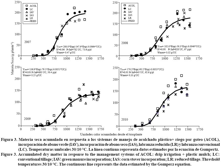 En 2009, la respuesta de las plantas de chile a los diferentes sistemas de manejo fue similar a través de todo el ciclo del cultivo, excepto por aquellas plantas de chile manejadas con ACOL y LR, que mostraron una MS por encima de los otros sistemas a las 1267 y 1366 UC. En 2010, la MS acumulada empezó a ser diferente desde las 970 UC, sobresaliendo las plantas de chile en ACOL por mostrar la más alta acumulación de MS durante el resto de la temporada.