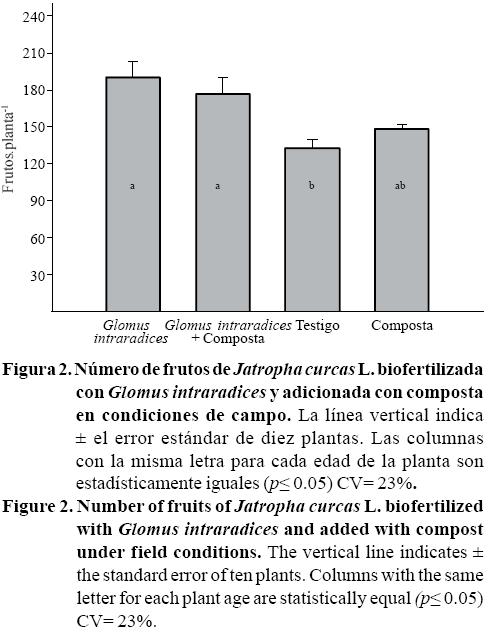 La condición nutrimental de las plantas micorrizadas no solo se refleja en el aumento en la tasa fotosintética, sino además, en la disminución de la conductancia estomática (Manjarréz-Martínez et al., 2009; Aguirre-Medina et al., 2005) y este hecho se expresa en mayor número de flores y de frutos. Al respecto, Kant y Wu (2011) mencionan que la época de floración y el número de eventos de floración en Jatropha, dependen de la falta de humedad y la nutrición de la planta y su deficiencia se refleja invariablemente en la producción de semillas. En papaya cv maradol, también se incrementó el número de frutos en plantas micorrizadas, inoculadas con G. mosseae 41.5% frutos por planta respecto al testigo, y con la inoculación con E. colombiana aumentó 22% (Vázquez-Hernández et al., 2011). En chile serrano Manjarréz-Martínez et al. (1999), citan que las plantas con G. intraradices produjeron más frutos en combinación con todas las dosis de vermicomposta.