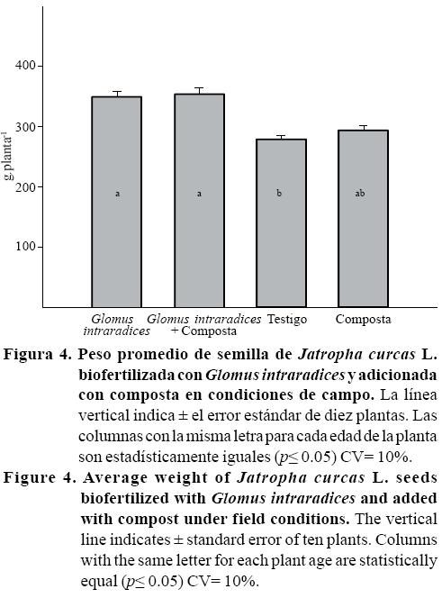 Kant y Wu (2011) citan que en Jatropha, la humedad disponible, así como la temperatura, son factores que afectan la producción de semillas. El desarrollo del micelio externo del hongo micorrízico, según Hodge et al. (2001) se incrementa por la presencia de materiales orgánicos naturales y esta situación se puede presentar con la combinación de los hongos micorrizicos más la aplicación de la composta y en consecuencia, el incremento en el peso promedio de las semillas de Jatropha. Los beneficios iniciales de los hongos micorrízicos en el desarrollo vegetal y reproductivo de Jatropha son de importancia agronómica, pero a través del tiempo, las plantaciones deben de ser abastecidas de todos los nutrimentos, especialmente las establecidas en suelos marginales. En las regiones tropicales el fósforo limita el crecimiento vegetal en la mayoría de los suelos, aun cuando está presente en grandes cantidades, su accesibilidad a las raíces para ser absorbido es incierta, debido a las interacciones con los coloides, a reacciones de precipitación con aluminio, hierro, calcio, o bien, a su reducida difusión, que favorece el desarrollo de zonas de agotamiento alrededor de las raíces absorbentes (Siqueira, 1998).