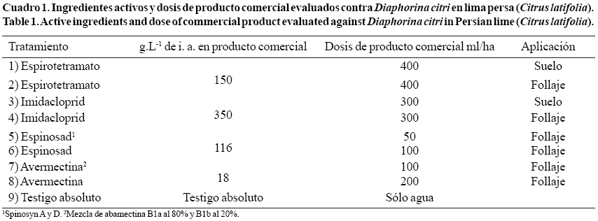 Se evaluaron formulaciones comerciales de imidacloprid, espirotetramato, spinosad y avermectina, los dos primeros aplicados al suelo y follaje y los últimos sólo al follaje, los tratamientos se enlistan en el Cuadro 1. Tanto al suelo como al follaje sólo se aplicó en una ocasión. El método y variables evaluadas fueron las mismas en ambos periodos.