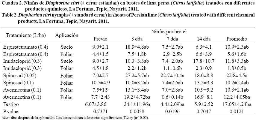 Ninfas por brote. En el primer muestreo, tres días después de la aplicación, en los tratamientos con espirotetramato e imidacloprid aplicados al follaje se observó 78.8% y 93.54%, respectivamente, menos ninfas que el testigo. En segundo lugar se ubicaron los tratamientos imidacloprid al suelo, spinosad (0.1 L ha-1) y avermectina (0.1 L ha-1) con un control de 69.8%, 70.6% y 61.6%, respectivamente. Siete días después de la aplicación, hubo diferencias significativas entre tratamientos, en los tratamientos con espirotetramato e imidacloprid aplicados al follaje y avermectina (0.2 L ha-1) se observó 34%, 75% y 86.3%, respectivamente, menos ninfas que en el testigo.