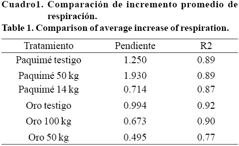 La mayoría de las tasas muestran un decrecimiento en la respiración, excepto por el tratamiento de Paquimé 50 kg que muestra un incremento promedio de 1.93 mLCO2 kg-1h-1 por día. Cuando la tendencia indica que al paso del tiempo la respiración disminuye. En el caso del testigo Paquimé muestra un descenso en la respiración de 1.25 mLCO2 kg-1h-1 por día.