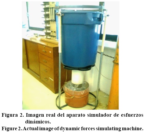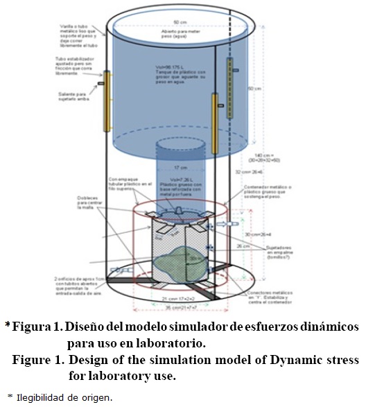 El diseño final del aparato creado para simular los esfuerzos dinámicos en laboratorio a escala se muestra en la Figura 1. En la Figura 2 se ilustra ya armado completamente con el material seleccionado y adaptado. El contenedor de mayor dimensión (bote azul) contuvo el peso que se adicionó para las pruebas, y el embolo blanco ejerció presión a la capa de fruta colocada en la parte inferior del contenedor y la malla. El contenedor inferior (anaranjado) junto con la capa plástica crea la atmósfera modificada (la cual se convertirá en una atmósfera controlada en forma posterior) donde se evaluó la respiración del fruto.