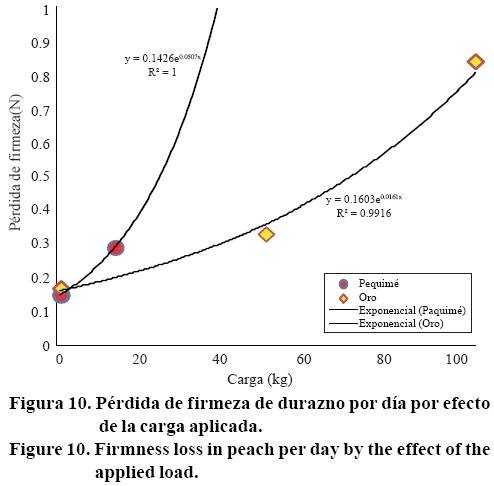 Por medio de un modelo estadístico de regresión no lineal se explica el comportamiento de la pérdida de firmeza respecto a la carga aplicada (Figura 10). Se observa una claro efecto de tendencia afectado por la carga donde a mayor peso existe una mayor pérdida de firmeza, y que es mayor esta pérdida cuando los frutos se encuentran en madurez de consumo como el caso de Paquimé, y un tanto menor cuando la madurez es fisiológica. Tal es el caso en el tratamiento Oro 50 kg existe un pérdida de 0.358N y para la carga de 100 kg la perdida de firmeza equivale a 0.8N. En el caso de Paquimé a una carda de 14 kg la firmeza disminuye 0.29 N.