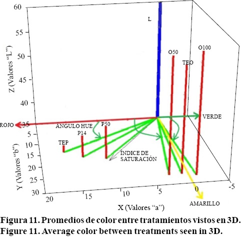 La diferencia en color entre los parámetros Angulo hue e índice de saturación se evaluó mediante un análisis de varianza y una prueba de Tukey p= 0.05 a los 6 tratamientos utilizando el programa de análisis estadístico SAS versión 9.3 (SAS, 2000).