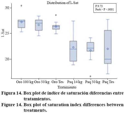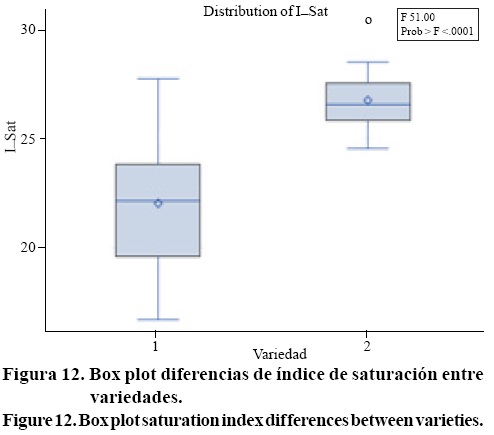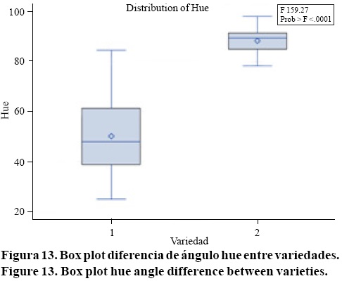 Los datos analizados en SAS nos arrojan las siguientes box plot que indica que existe diferencias significativas (p< 0.05) entre variedades tanto para el índice de saturación (Figura 12) como para el ángulo hue (Figura 13). Asimismo, se encuentran diferencias significativas entre tratamientos de diferentes variedades, más no entre tratamientos de la misma variedad tanto en índice de saturación (Figura 14), como en ángulo hue (Figura 15).