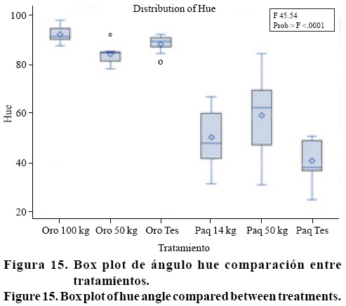 Los promedios de color comparando ambas variedades Oro de Tlaxcala y Paquimé muestran la clara diferencia ente variedades, puesto que una tiende al rojo (Paquimé) y la otra al amarillo (Oro de Tlaxcala), con una mayor luminosidad o claridad la variedad Oro de Tlaxcala y ángulos hue mayores para la misma (Figura 11).