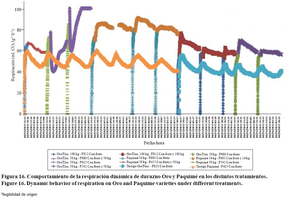 La velocidad de respiración (CO2) se cuantificó mediante un sistema dinámico de flujo continuo, utilizando un medidor de CO2 TELAIRE conectado al HOBO data logger (para medir temperatura, humedad relativa, intensidad luminosa, y calcula punto de rocío), un tablero de flujo continuo el cual controló la cantidad de aire que ingresaba al contenedor herméticamente cerrado que contenía un cierto número de duraznos de peso conocido. Se utilizó nitrógeno como gas acarreador para hacer un barrido de gases y comenzar la lectura de CO2 desde 0.