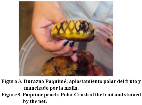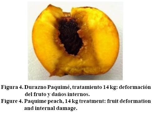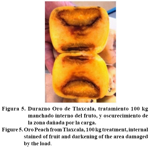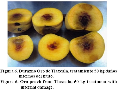 La aplicación de carga en los frutos de durazno se tradujo en deformación del fruto, oscurecimiento interno en la parte donde se aplica la carga y alrededor del endocarpio, pérdida de peso y firmeza.