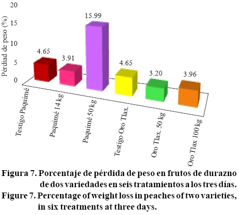 La pérdida de peso obtenida en Paquimé 50 kg es considerable debido a que el grado de madurez del fruto permitió ruptura y derramamiento de jugo del fruto. Mientras que los testigos de ambas variedades presentaron el mismo comportamiento, el tratamiento de Paquimé 14 kg y Oro 100 kg mostraron un patrón de respuesta similar en pérdida de peso y Oro 50 kg perdió menos peso que los anteriores.