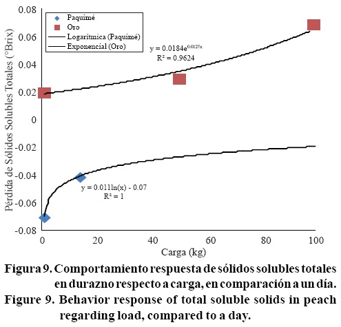 La respuesta de los frutos a la aplicación de carga muestra que en el caso de mayor carga, hay un aumento de pérdida de grados brix. Existe un comportamiento decreciente en la cantidad de sólidos solubles totales al paso del tiempo, no así para el caso de Oro Tlaxcala 100 kg quien muestra un incremento (Figura 9).