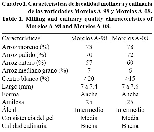 El arroz descascarado o integral tiene una longitud de 7.6 mm, con color predominantemente marrón claro, con aroma oloroso. El arroz pulido tiene un contenido de amilosa de 25%, con endospermo traslucido, con centro blando predominante mayor a 15%, con un peso de mil granos de 28 g y un porcentaje de arroz pulido de 60%, y temperatura de gelatización intermedia. Las características de calidad molinera y culinaria de las variedades Morelos A-98 y Morelos A-08 se muestran en el Cuadro 1.