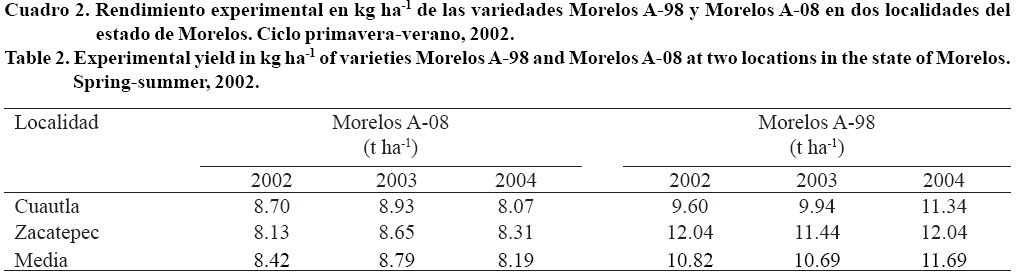 Bajo condiciones de siembra directa esta variedad presenta excelente respuesta a las condiciones ambientales de las zonas "alta" (1 000-1 400 msnm) y "baja" (800-1 000 msnm) de Morelos. Puede responder favorablemente al sur del estado de México, Puebla, Michoacán, Jalisco y Norte de Guerrero (Montaña) al igual que la variedad Morelos A-98 y Morelos A-2010. El rendimiento experimental de esta variedad, en comparación con Morelos A-98 en el año 2002 se muestra en el Cuadro 2.
