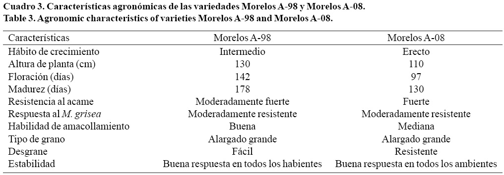 La variedad MorelosA-08 por tener progenitores de paja corta la hace tolerante al acame al igual que la variedad Morelos A-2010, pero diferente de las variedades Morelos A-92 y Morelos A-98, algunas características que la diferencian con la variedad Morelos A-98 se muestran en el Cuadro 3.