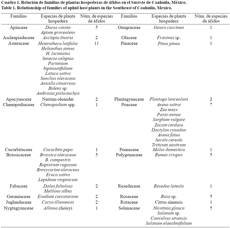 De un total de 5 320 pulgones colectados en 5 municipios de Coahuila se montaron 3 853, de los cuales se analizaron un total de 423 laminillas que fueron los insectos mejor montados, estos se trasladaron al Centro Nacional de Referencia Fitosanitaria de la Ciudad de México para analizar y tomar las fotografías correspondientes, todas provenientes de las colectas directas de 22 familias de plantas hospederas (Cuadro 1), en dicho cuadro podemos observar que la familia Asteraceae es la que presentó mayor número de áfidos. Asimismo, el mayor número de especies registradas, esto es semejante a lo que menciona Trejo-Loyo (2004) en su investigación que trabajo con 5 8 familias hospederas, de estas, la familia Asteraceae fue quien presentó mayor número de hospederas y por ende de especies de áfidos. A la familia anterior le siguen las familias Poacea, Brassicaceae, Solanaceae, Apiaceae, Asclepiaceae, Bygnonaceae, Chenopodicaea, Cucurbitaceae, Fabaceae, Geraniaceae, Juglandaceae, Nygtaginaceae, Onagraceae, Olaceae, Pinaceae, Plantagynacea, Poaceae, Pomaceae, Polygonaceae, Resedaceae, Rosaceae y Rutaceae.