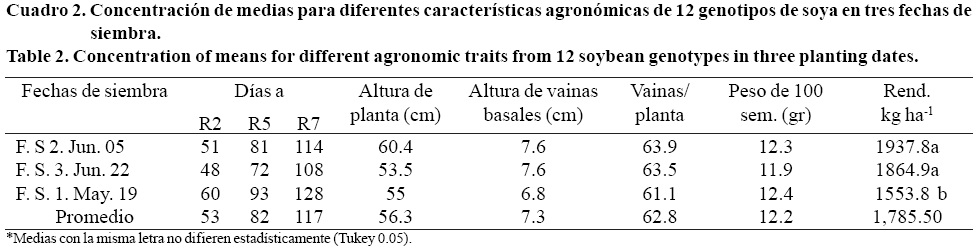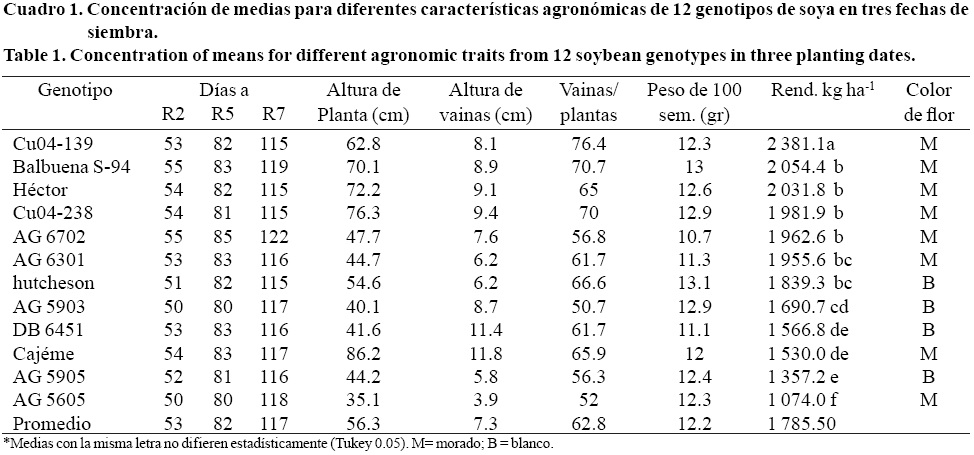 Se observó diferencia significativa (p< 0.001) para las variables días a floración (R2); días a formación de grano (R5); días a madurez fisiológica (R7); altura de planta; y rendimiento, en ambos factores estudiados, genotipos y fechas de siembra, y su interacción, así como en peso de 100 semillas en ambos factores y altura de vainas basales entre genotipos, mientras que para el número de vainas por planta, se observó diferencia estadística significativa (p< 0.005) en ambos factores y su interacción; para altura de vainas basales entre fechas de siembra y su interacción con genotipos no se observó diferencia significativa, lo mismo que para peso de 100 semillas entre fechas de siembra. Sin embargo, los datos se consideran estándar y aceptables para genotipos comerciales de soya para el norte de Sinaloa, con excepción de la altura de vaina en la que los genotipos AG 5905 y AG 5605 mostraron una altura reducida (Cuadro 1) que en el momento de la cosecha propicia la perdida de grano por no alcanzarse a trillar, además resultaron los de menor rendimiento, por debajo de 1.5 t ha-1.