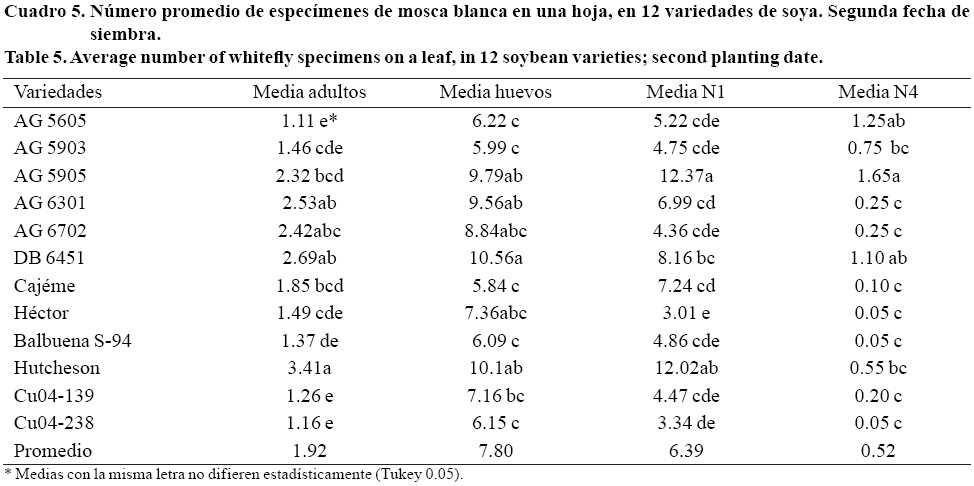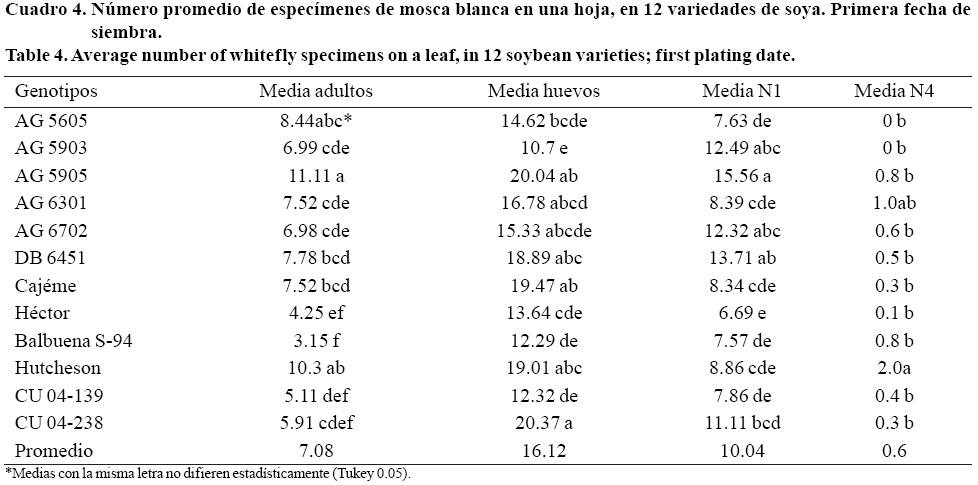 En la primera fecha de siembra, para cada estado de desarrollo el ANVA mostró diferencia significativa entre tratamientos (p< 0.001) (Cuadro 4); la variedad AG 5905 resultó la más infestada (preferida) por adultos de MB, pero sin diferenciarse de Hutcheson y la AG 5605; en contraste la variedad Balbuena S-94 fue la menos infestada, sin diferenciarse estadísticamente de Héctor, Cu04-139 y Cu04-238.