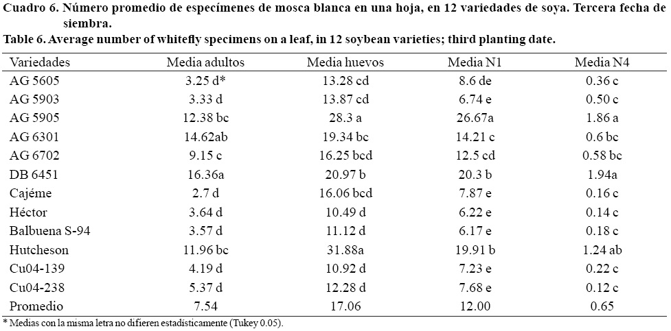 En la última fecha de siembra la mayor cantidad de adultos de MB ocurrió en DB 6451 y AG 6301(p< 0.001); las variedades menos infestadas fueron siete de las 12 evaluadas, en menor grado Cajéme (Cuadro 6). La mayor cantidad de huevo ocurrió en las variedades Hutcheson y AG 5905; las variedades Héctor, Balbuena S 94, Cu04-139 y Cu04-238 se observó la menor cantidad, sin diferenciarse de AG 5605, AG 5903, Cajéme y AG 6702. Las N1 fueron más abundantes en la variedad AG 5905, seguida en diferente grupo de medias por DB 6451y Hutcheson; con menor incidencia fueron las variedades Héctor, Balbuena S 94, AG 5903 AG 5903, Cu04-139, Cu04-238, Cajéme y AG 5605. Finalmente el mayor número de N4 la registraron las variedades DB 6451, AG 5905 y Hutcheson; el resto de los cultivares, en primer lugar Cu04-23 8, mostraron la cantidad más reducida de especímenes de esta etapa de desarrollo.
