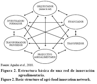 La estructura básica de una red de innovación agroalimentaria podría representarse por una compleja red en la que algunos agentes aportan recursos económicos (nodo financiador), otros generan información y conocimientos (nodo investigador o generador), otros la adaptan e incorporan para la producción de bienes comerciables en forma de maquinaria, equipo e insumos para la producción, o bien bienes y servicios para el consumidor (nodo proveedor o transformador), otros la difunden o facilitan el aprendizaje con fines de adopción (nodo transferidor o facilitador), y otros finalmente la adaptan, la aplican y generan nuevo conocimiento o demandas a la red (nodo productivo agroalimentario -agricultor, ganadero, agroindustrial, etc). En no pocas ocasiones, un mismo agente o nodo puede desempeñar dos o más roles en forma simultánea, Figura 2.