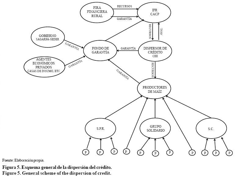 Para la dispersión de los recursos se plantea un esquema integrado por el DC, el IFR, el FG, los Productores, FIRA y Financiera Rural (Figura 5).