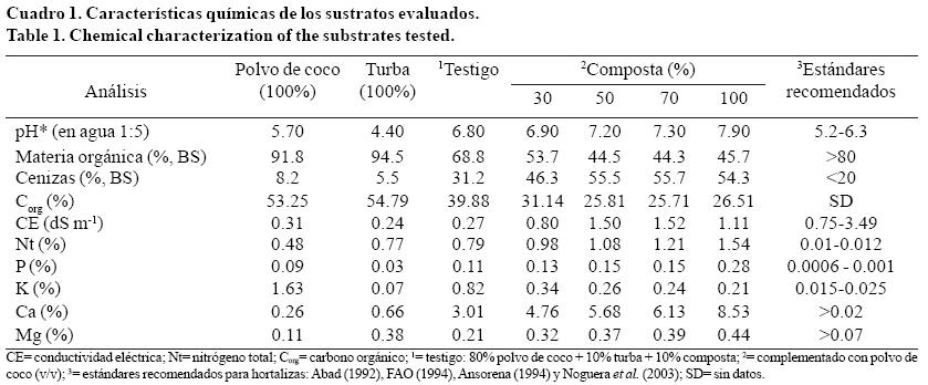Sustratos utilizados. Se utilizó polvo de coco (PC) producido a partir de la fibra del pericarpio del fruto de la palmera de coco (Cocos nucifera) proveniente del estado de Michoacán, México; turba (T) del musgo Sphagnum spp., originaria de Canadá, y composta de bagazo de agave (C) con cinco meses de compostaje elaborada en un área cercana al sitio de estudio con 100% de bagazo de agave fresco, en pilas en forma de cordón, con aireación mecánica durante un periodo de 20 semanas. Con esta composta se elaboraron las mezclas que se indican más adelante.