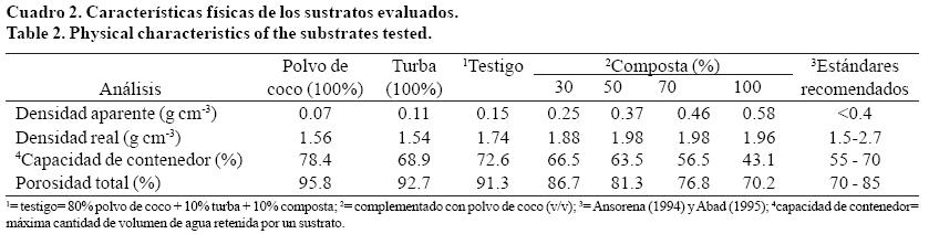 Con respecto a la influencia de las compostas 30%, 50% y 70% sobre las características físicas del sustrato (Cuadro 2), destaca sobre todo la densidad aparente, que es la medida de la biomasa seca por unidad de volumen. En las compostas antes citadas, este valor fue de 0.25, 0.37 y 0.46 g cm-3 respectivamente; las dos primeras, se ubicaron dentro del nivel recomendado para sustratos (<0.4 g cm-3) (Ansorena, 1994 y Abad, 1995), mientras que la composta 70% fue un poco superior al límite. Comparadas con el testigo, estas compostas tuvieron una densidad aparente dos a tres veces superior, lo que pudiera atribuirse a que el compostaje del bagazo se realizó sobre el suelo desnudo, y por lo tanto, contenía partículas de suelo. No obstante, el mayor peso por volumen de las compostas puede representar una ventaja para plantas de agave que se cultivan durante varios meses en invernadero, ya que al ser más pesado el contenedor, éste se mantiene estable en el piso, lo que no se logra con los sustratos comerciales que son más ligeros.