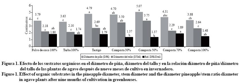 En la Figura 1 se aprecia que el diámetro de la piña (DPñ) y del tallo (DTll) aumentaron progresivamente al incrementarse la proporción de composta de agave en el sustrato, observándose el mayor diámetro en el sustrato composta 50%, superando a los sustratos de polvo de coco y turba.