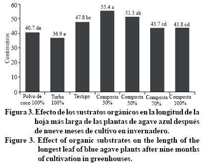 Blue agave is the raw material for the production of tequila through a distillation process that generates about 400 thousand tons of bagasse, which, in part, is transformed into compost. Micro-propagated agave plants require an adjustment period of about nine months in the nursery or greenhouse shade, for which is grown in a container with a commercial substrate. For this stage, there are still no morphological parameters that serve as reference for evaluating the quality of the plants that can be planted in the field. For this reason, the aim of the study was to evaluate some morphological responses of seedlings of blue agave (micro-propagated) grown with different organic substrates: A commercial substrate (80% cocoa powder, 10% peat and 10% agave bagasse compost), coconut powder, and Canadian peat and four compost mixtures of agave bagasse. We established a completely randomized design with four replications, considering each plant as the experimental unit in greenhouses, between September 2007 and June 2008 in Tequila, Jalisco, Mexico. The results were statistically evaluated using ANO VA and mean comparisons by DMS. The substrate mixtures with the best results were with the compost treatments bagasse at 50%, followed by 30% of the compost and finally 70%, supplemented with coconut powder. The maximum values of the study variables recorded were: pineapple diameter, 5.0 cm, stem diameter, 3.8 cm, number of leaves, 15; leaf length, 55.4 cm and width of the longest leaf, ~ 4 cm, measures that could be used as agave quality standards before field planting.