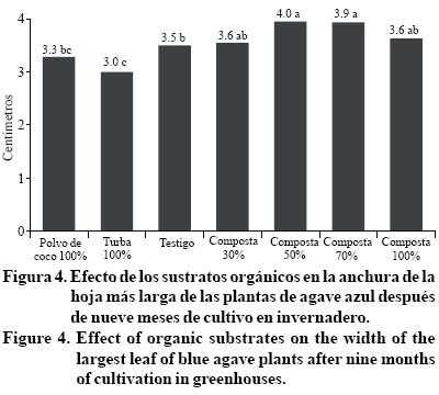 Con respecto a la diferencia en la anchura de la hoja más larga de los agaves, en la Figura 4 se aprecia que los valores más altos correspondieron a todos los tratamientos con composta, destacando en primer lugar la composta 50% y en segundo lugar la composta 70%, aunque de acuerdo a la prueba de comparación de promedios todas las mezclas de compostas resultaron estadísticamente iguales entre sí. No obstante, las dos compostas antes citadas superaron estadísticamente al testigo, al polvo de coco y a la turba, con medidas que fluctuaron entre 0.5 y 1 cm respectivamente.