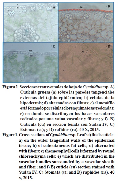Las hojas de la plantas de Cymbidium estudiada son conduplicadas, rígidas y coriáceas. El tejido epidérmico, está formado por un estrato de células de forma cuadrada a circular y con una cutícula gruesa (Figuras 1A y 1B) que se proyecta hacia las paredes anticlinales. Las células guarda, son superficiales (Figura 1C) y presenta poros fusiformes en la parte central. En C. ensifolium, la cutícula cubre los estomas y parte de las células guarda se eleva por encima de la cutícula. Éstas características pueden ser una modificación xerofítica (Du Puy y Cribb, 2007).