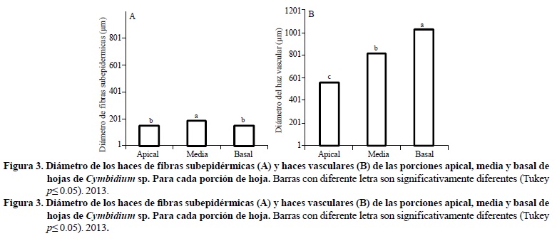 Diámetro de fibras subepidérmicas. Los haces de fibras subepidérmicas presentaron el mayor diámetro (184.55 µm) en la porción media de las hojas en comparación con la parte basal y apical (Figura 3A). Éstas células son características comunes de este género y de los miembros de la Subtribu Cymbidiinae cuya función es la de rodear y fortalecer las células parenquimatosas del mesófilo (Yukawa y Stern, 2002). También se relacionan con su adaptación xerofítica, lo que ayuda a controlar la pérdida de agua en la hoja por condiciones de estrés hídrico (Zanenga-Godoy y Goncalves, 2003).