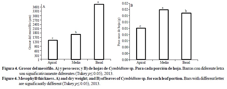 La porción media de las hojas de Cymbidium sp., presenta el mayor grosor de la cutícula, del tejido epidérmico, el diámetro de las fibras subepidérmicas y peso seco de hoja. El mayor diámetro de los haces vasculares y del grosor del mesófilo se presentaron en la región basal de la hoja.