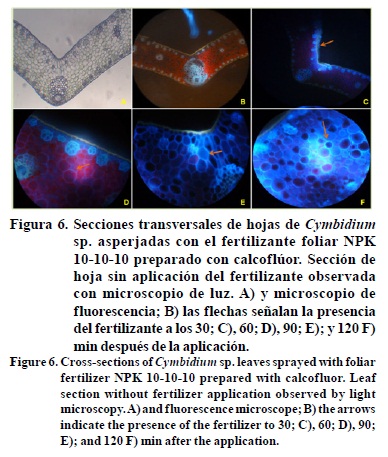 Fertilizante foliar más calcoflúor (F-C). El F-C se acumuló en la cutícula después de los 30 min de haber hecho la aplicación (Figura 6C). Una hora después, se observó entre las células epidérmicas y del mesófilo (Figura 6D) con una fluorescencia tenue. A los 90 y 120 min después de la aspersión, el F-C se encontró en todas las células del parénquima esponjoso (Figuras 6E y 6F). También se observó la acumulación del fertilizante en la cutícula y en el tejido epidérmico de las superficies daxial y abaxial.