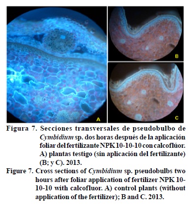 Dos horas después de haber aplicado el fertilizante a las hojas de Cymbidium sp., se observó su presencia en las células parenquimatosas de los pseudobulbos (Figura 7A), se identificaron células redondas e irregulares y tejido vascular ubicados en diferentes puntos.