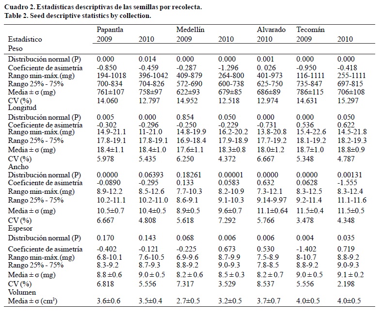 Distribuciones de tallas. Las semillas con longitudes, anchos y espesores reducidos fueron más abundantes en sus distribuciones, excepto para el caso de Tecomán; que produjo las semillas más largas, anchas y de mayor espesor durante los dos años de las recolectas (Cuadro 2, Figura 2b), seguido por Papantla (2% más abajo); mientras que las recolectas de Alvarado y Medellín fueron 4% más cortas, 18% más angostas y 4% más delgadas que las de Tecomán. Las relaciones de ancho a longitud y espesor a longitud de las semillas fueron diferentes entre las recolectas (p< 0.001), con un rango promedio para el ancho entre 49-61% del largo de la semilla y un rango medio en espesor entre 46.5-49% del largo de la semilla.