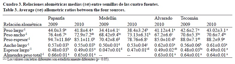 El volumen de la semilla fue diferente para cada fuente (p< 0.01) durante los dos años; sin embargo, este permaneció similar en cada fuente año tras año (p> 0.4). Los CVs variaron menos 5 % en todas las fuentes, lo cual indica que el volumen fue el parámetro más constante en las semillas. Tecomán tuvo los mayores volúmenes (p< 0.05), seguido por Alvarado y Papantla, que fueron similares estadísticamente (p> 0.05); los volúmenes promedio más bajos se encontraron en las semillas de Medellín.