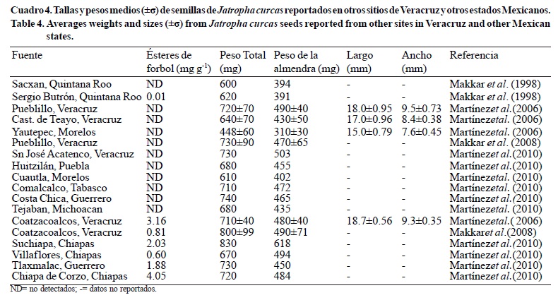 Pueblillo Veracruz de Martínez et al., (2006) y Makkar et al., (2008), correspondientes a el sitio de Papantla de este estudio, tuvieron pesos muy similares (promedio ± o). Las plantas localizadas en esta región son resultado de una selección humana del genotipo no tóxico que se consume en los platillos tradicionales (Aguilera, 2004). Por lo que la alta uniformidad encontrada en los pesos y tallas de sus semillas podría ser resultado de que estos ejemplares estén emparentados y además sujetos a las mismas condiciones agroclimáticas y prácticas de cosecha (Pompelli et al., 2010). Sin embargo, se requieren estudios morfológicos más extensivos para confirmar esta hipótesis.