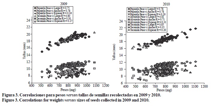 Análisis de correlación. Las correlaciones de pesos contra tallas de semillas para todas las recolectas estuvieron normalmente distribuidas (p> 0.15). Las correlaciones entre peso contra longitud, ancho y espesor fueron significativas (p< 0.01) (Figura 3). La mayor correlación positiva se obtuvo con la longitud versus peso (0.86< r < 0.92). Por otra parte, el espesor obtuvo la menor correlación positiva con el peso en todas las fuentes (0.4< r <0.52).