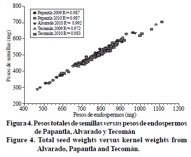 Análisis de los endospermos. Los pesos de los endospermos fueron estadísticamente similares para todas las recolectas analizadas (p= 0.09). Todas las correlaciones tuvieron distribuciones normales y mostraron r's > 0.99, entre los pesos de sus endospermos y el peso total de sus semillas (Cuadro 3, Figura 4).
